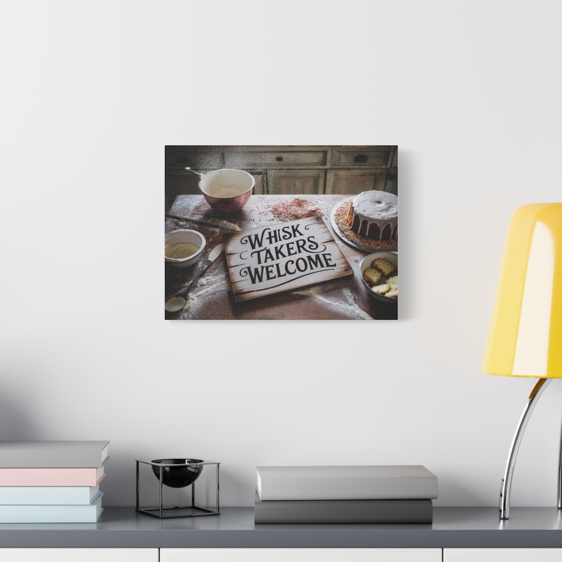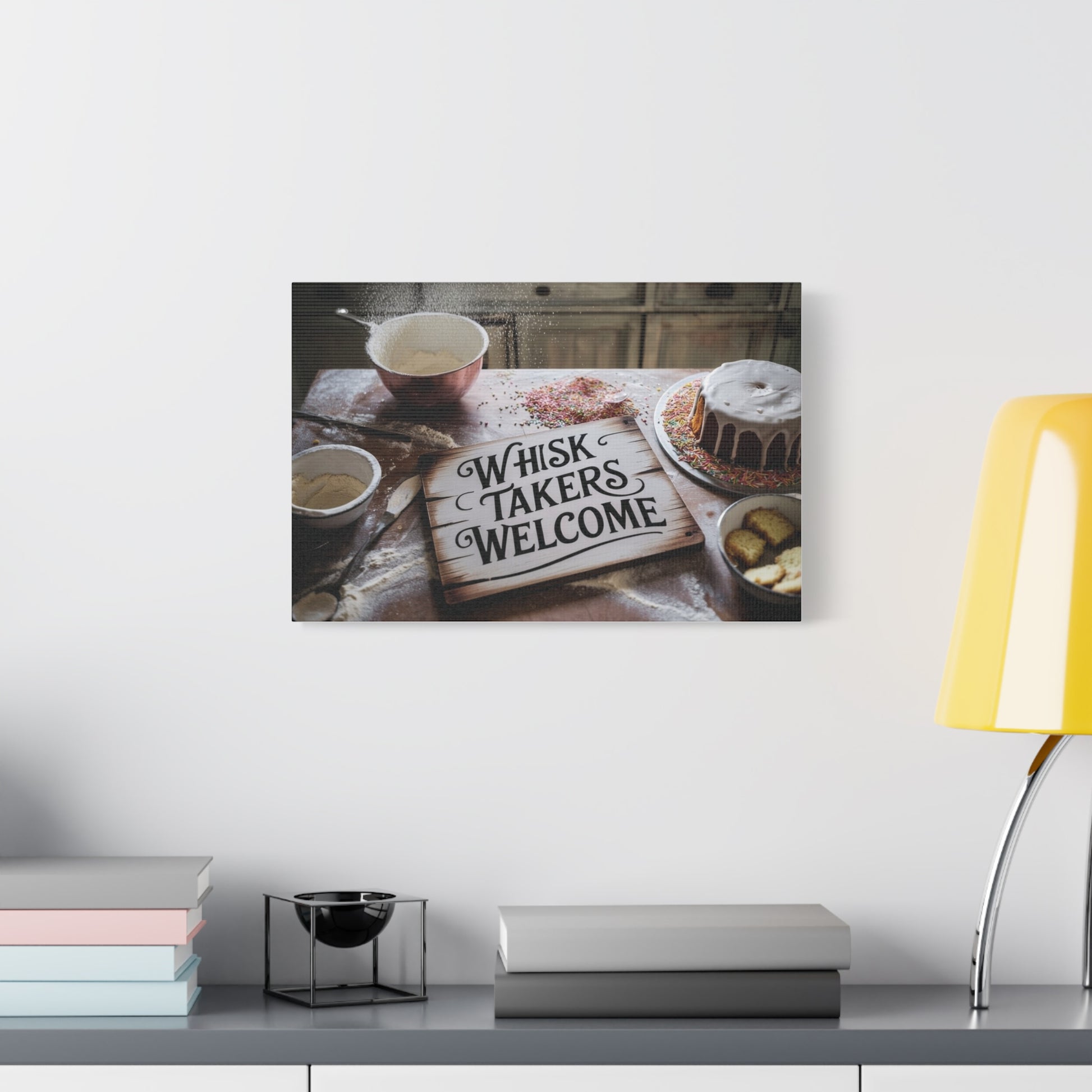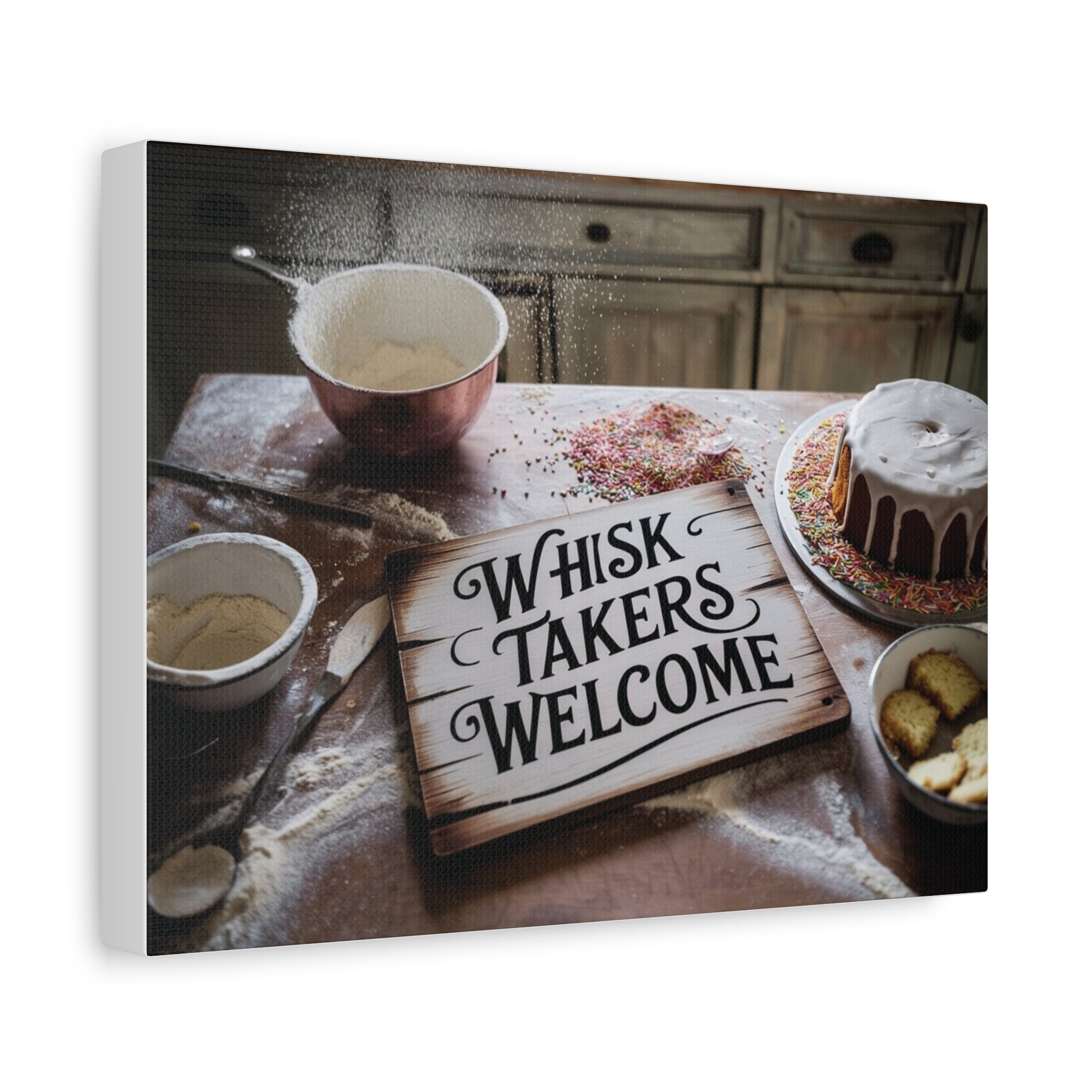 Whisk Takers Welcome wall canvas to highlight messy bakers willing to try anything. Perfect for bakers who love experimenting in the kitchen and adding a touch of humor to their decor. Ideal for kitchen or dining room wall art. Great for bakers, home cooks, and baking enthusiasts. Relevant for holidays like Thanksgiving, Christmas, and birthdays.