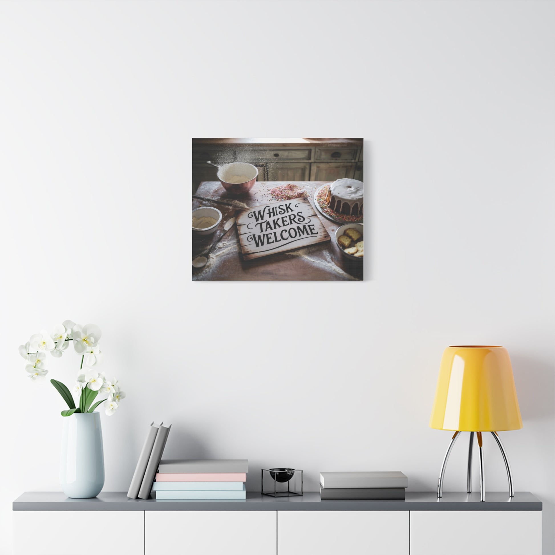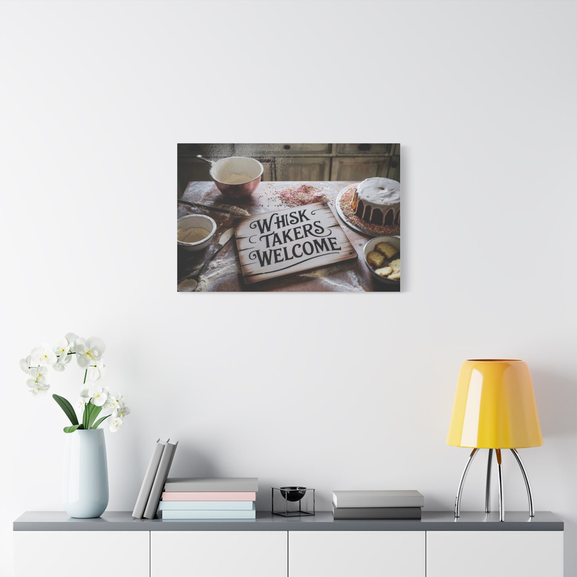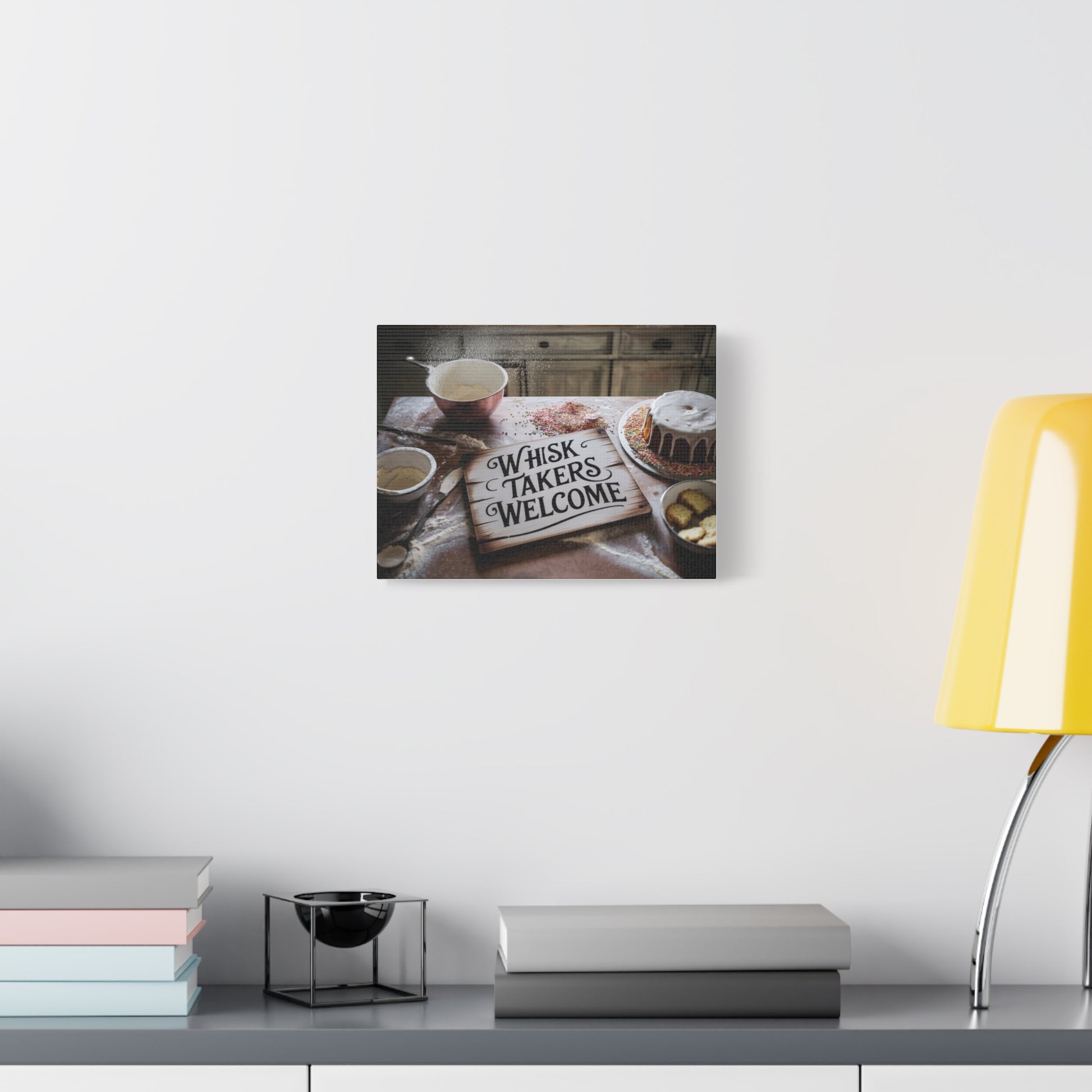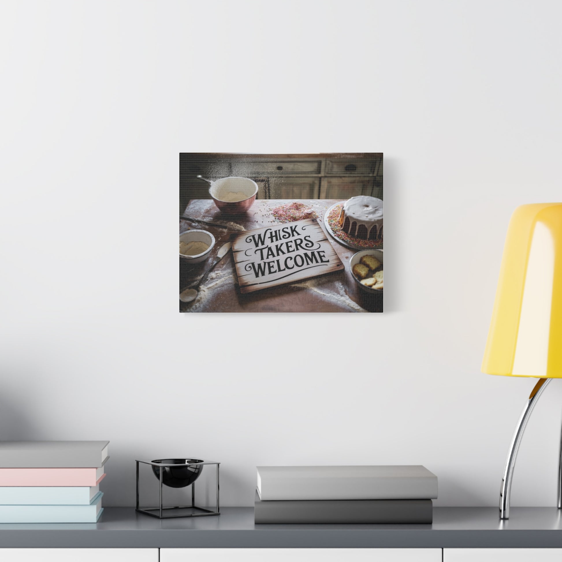Whisk Takers Welcome wall canvas to highlight messy bakers willing to try anything. Perfect for bakers who love experimenting in the kitchen and adding a touch of humor to their decor. Ideal for kitchen or dining room wall art. Great for bakers, home cooks, and baking enthusiasts. Relevant for holidays like Thanksgiving, Christmas, and birthdays.